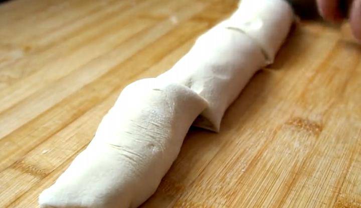 第四步:在面皮上面抹一層食用油,撒上一層椒鹽和面粉,然後從下往上卷起來,切成大小均勻的5個劑子。