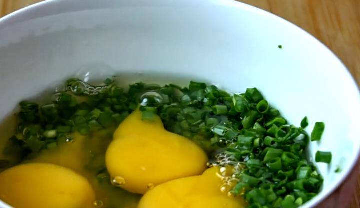 第二步:準備一點小蔥切成蔥花放在碗中,加上一點食鹽、打上雞蛋3個攪拌均勻,作為備用。