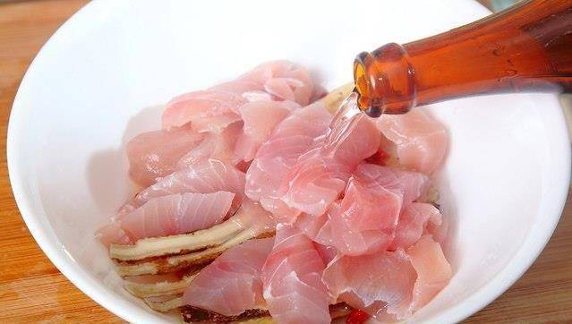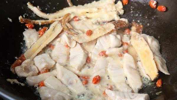 起一熱鍋,倒入適量油,待油溫約攝氏160度,將魚片放入炒至變色,再加入步驟二的藥材與醃制用的米酒醬汁。