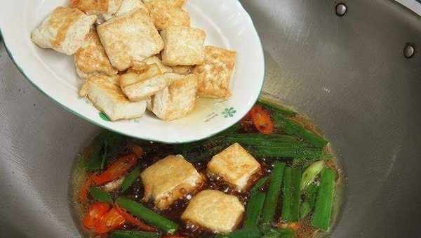 起油鍋,先放入豆腐煎至兩面焦黃後,盛起備用。鍋中放入青蔥與紅辣椒絲炒至香味溢出,再倒入200c.c.水開中火煮至沸騰。
