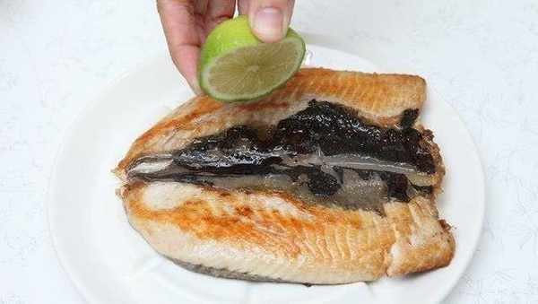起鍋後,用厚廚房紙巾將多餘的魚油吸掉。最後把切好的薑絲擺放在虱目魚肚旁搭配食用,同時滴上幾滴檸檬汁提味。
