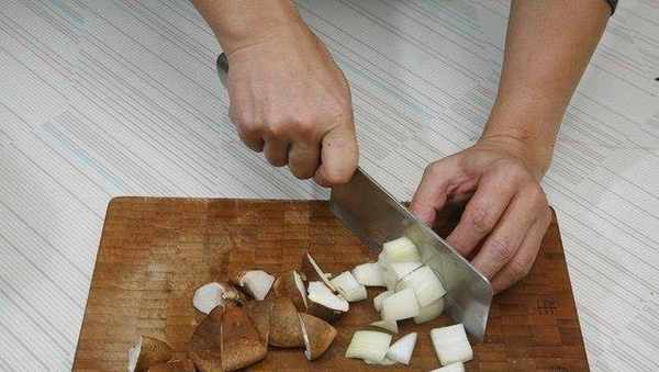 洋蔥切塊、香菇切塊、蒜頭切片備用。