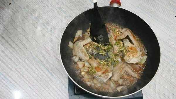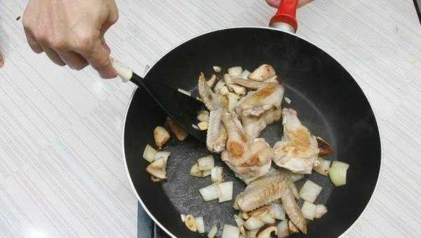 熱鍋註油,加入雞翅或棒棒腿、蒜頭片、洋蔥塊、香菇塊以中火爆香。