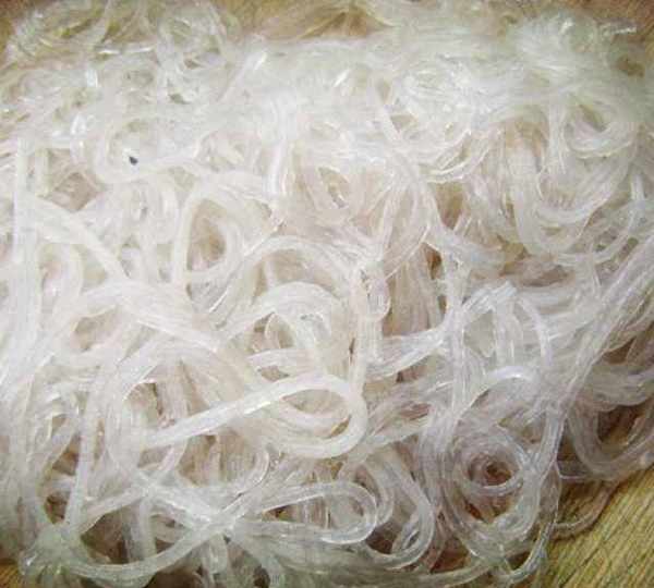 第3步、粉條溫水泡開,再上鍋煮熟,撈出剁碎。拌入韭菜餡裡。五香粉 蠔油 雞汁 雞精 鹽拌勻。