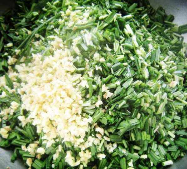 第2步、韭菜洗凈控幹水分,切碎,生薑切碎。倒入少許橄欖油拌勻。