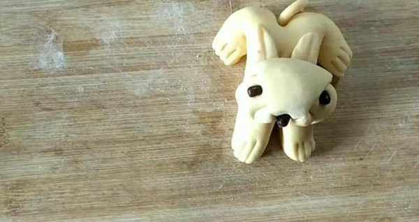 底部捏緊,用牙簽在耳朵中間分別壓一下,但用筷子按出兩個,放上蜜紅豆,在鼻子的位置也放上蜜紅豆,再放上一個枸杞做舌頭,然後讓他擺放好,取一小塊面團搓成長條,全部做好以後放入溫水鍋中,二次醒發10分鐘,型發質體積是原來的1.5倍大開火,水開以後將20分鐘5分鐘出鍋,南瓜饅頭這樣做不塌陷不回,縮東軟香甜,造型美觀,大人和孩子都喜歡吃。