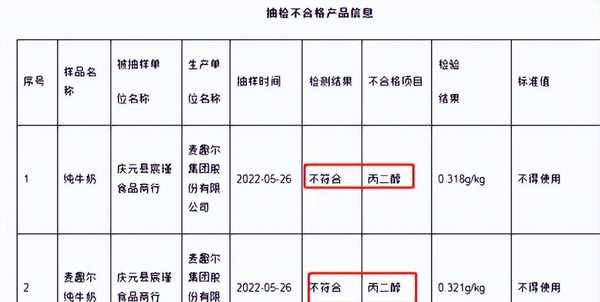 在2022年5月26日的抽樣中,麥趣爾旗下的純牛奶和麥趣爾純牛奶雙雙被檢測出瞭丙二醇。