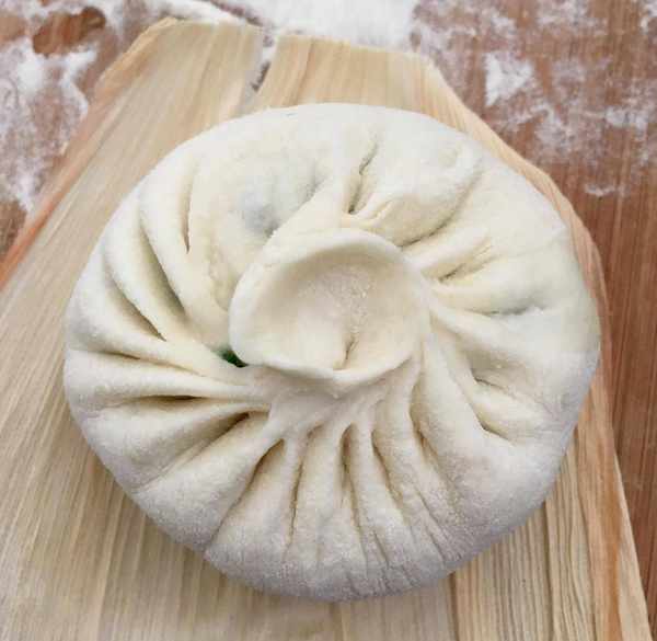 面皮中間放入足量的餡料捏上褶子包成包子胚放在幹凈的玉米棒子葉上