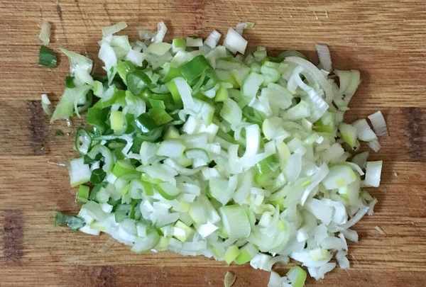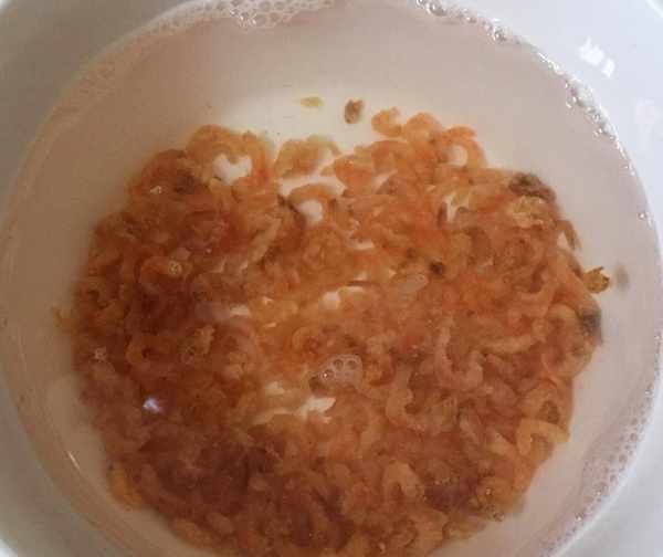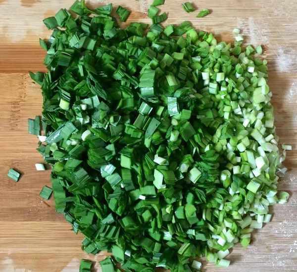 大蔥一顆,韭菜150克擇去老葉子清洗幹凈,分別切成蔥花和韭菜末。海米適量放入碗中浸洗幹凈。因為山麻楂非常適合與海鮮搭配在一起制作餡料,所以根據自己的喜好加入點海米、蛤蜊肉、扇貝肉都可以。