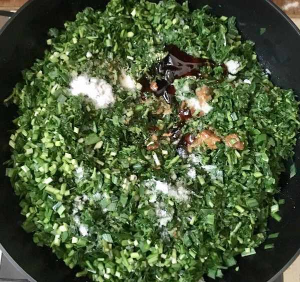 把蔥花、海米、韭菜末、山麻楂碎放入炒好放涼後的鍋中,分別加入適量的鹽、蠔油、香油攪拌均勻即可。