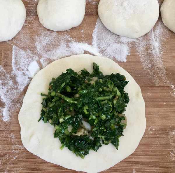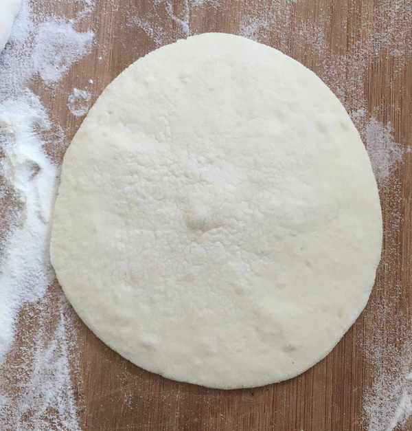 發酵好的面團撒上一層幹面粉反復的揉面至內部沒有孔洞,搓成長條狀切成大小均勻的面劑子再挨個揉幾次放置再次醒10分鐘,然後搟成中間厚邊緣薄的面皮