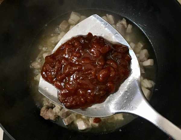 肥瘦相間的豬肉400克根據自己的喜好切成肉丁或肉片,熱鍋加入多一點的花生油把肉丁炒香後放入豆瓣醬繼續炒香,最後烹入適量的料酒關火放涼備用。