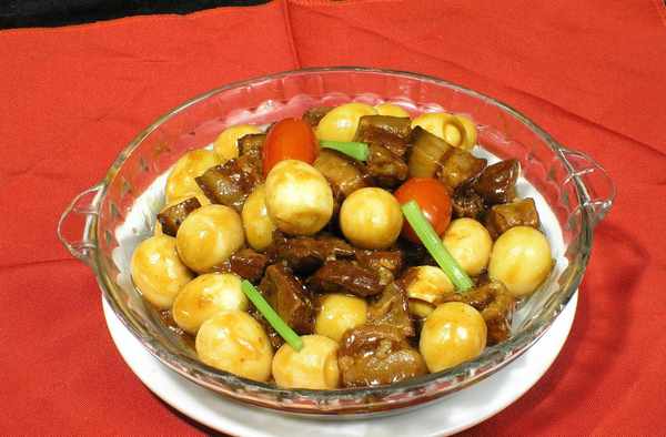 主料:五花肉250g、鵪鶉蛋200g;調料:食鹽適量、味精適量、老抽適量、調和油適量。