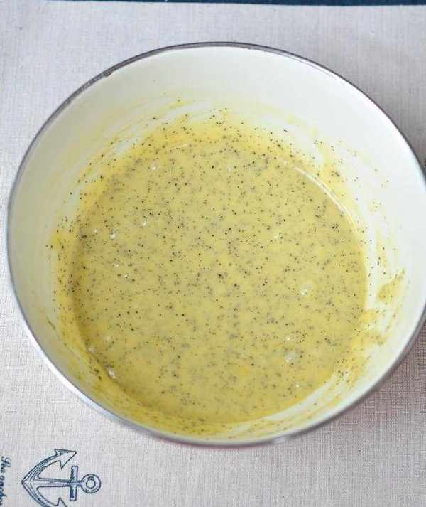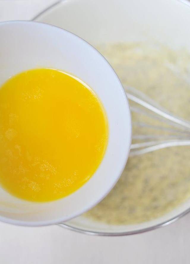 4.黃油稱好,用微波爐加熱20秒左右至完全融化。將融化的黃油加入面糊中,攪拌均勻。