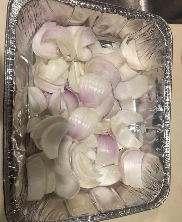 在錫箔紙烤盤上鋪墊一層洋蔥。