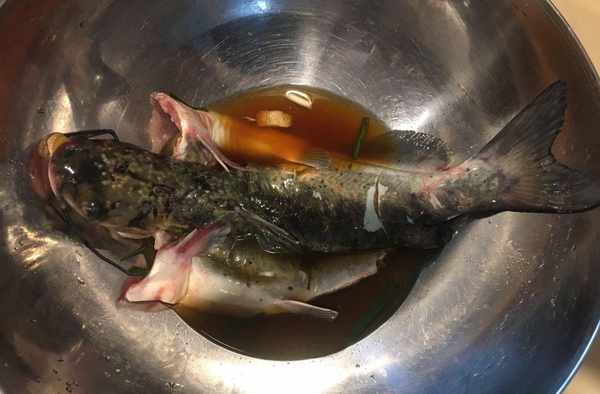 把魚對半破開,不要斷,兩邊魚身上劃兩刀,塗抹食鹽,再加料酒,生薑,生抽,花椒水,醃制2小時。