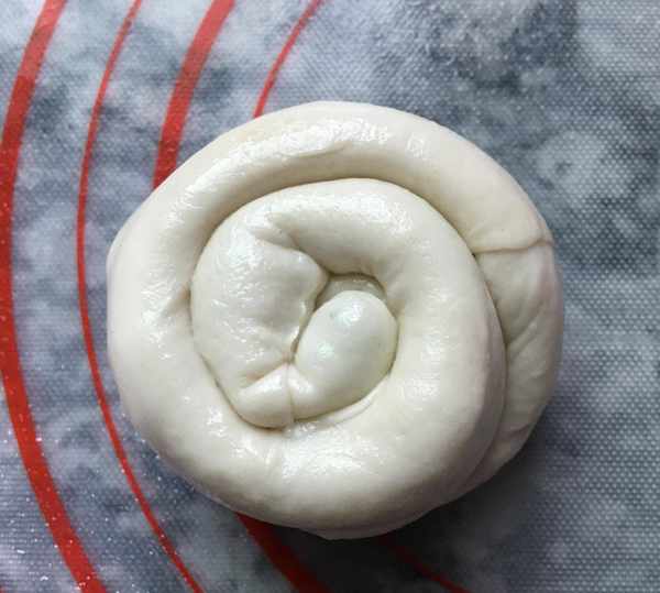 4,把面皮從一頭卷向另一頭,卷好後再按螺旋狀盤起來,最後的尾巴收進褶子裡,然後輕輕搟薄。