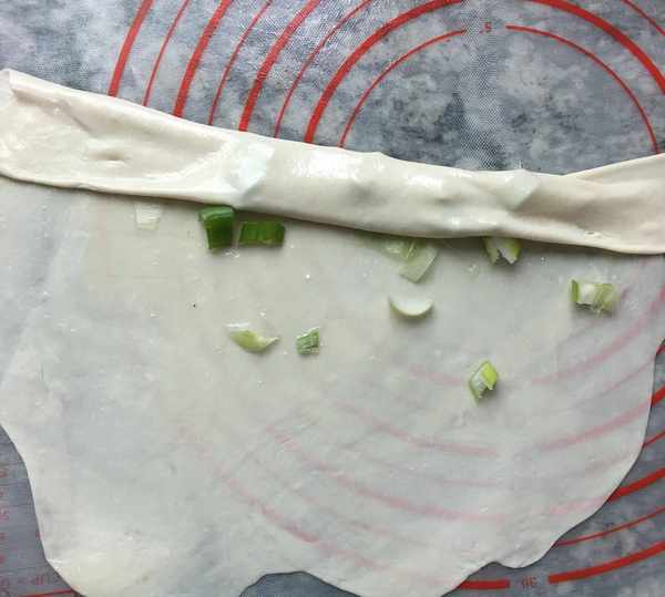 3,在面皮上刷勻油酥(油酥按面粉和油2:1的比例調成稀油酥就可以,油酥裡放少量鹽一起攪勻),撒點蔥花。