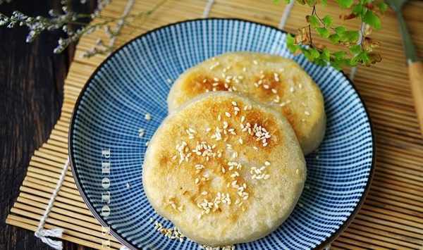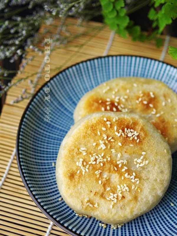 8、不粘鍋倒入玉米油燒熱;放入餡餅,小火煎黃後,倒入適量清水,上蓋,繼續煎;