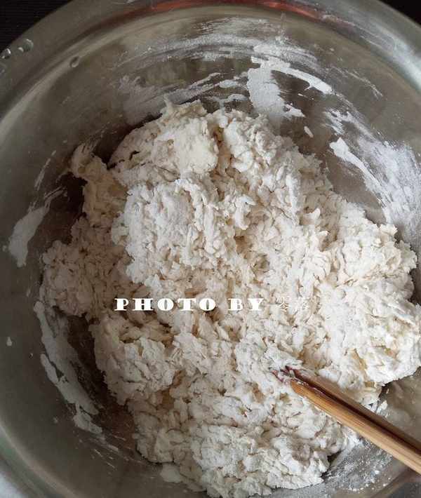 2、當所有面粉抱團後,能用筷子叉起,而且面團表面沒有大縫隙,就不用加水瞭;