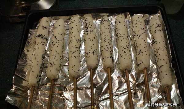 Step1.用電爐煮白米,趁熱用搟面杖把米搗成粘團,手沾鹽水,把飯團放在竹筷子上,成直輪狀,放在案板上板卷起堅實。