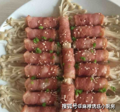 這個是培根包金針菇,做好瞭擺成一個這樣的形狀,大傢猜猜是什麼?很簡單的一道菜,但是味道確非常好。我中途還刷瞭幾遍醬料,為瞭更有風味和顏色更好看,如果是海外黨做這道菜就更簡單瞭,由於國外培根都比較肥,所以基本上不用翻面都不會糊底。