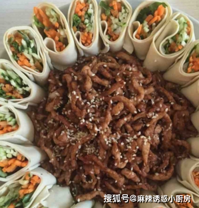 來一道硬菜,京醬肉絲。看起來就不太一樣是不是,可是花瞭我很長時間呢。醃肉剩下的雞蛋又攤瞭蛋餅。一樣加入火腿黃瓜卷起切斷,不一樣的味道。