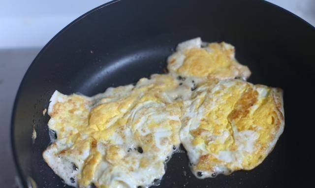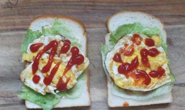 弟弟不是很愛吃雞蛋,但是做三明治時為瞭保證一天的營養需要,他先煎雞蛋,鍋裡放少量食用油,加少許鹽調味,煎至可以熟瞭!