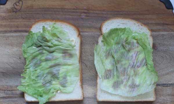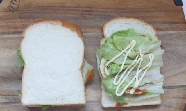 5.鋪上沙拉醬,淋上沙拉醬,最後淋上面包片,讓面包片兩面貼合!