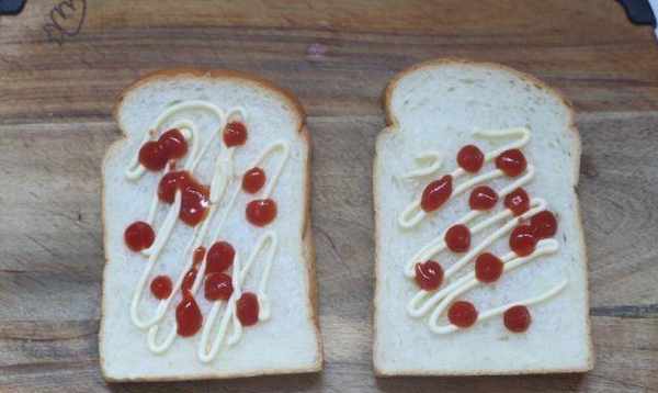 1.切片後的面包上抹上番茄醬和沙拉醬。這是為瞭將口味融合在一起並更好地匹配填充成分。