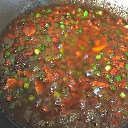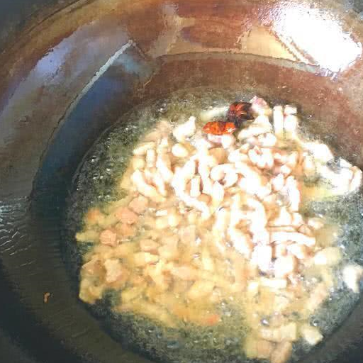 1.首先將熱鍋涼油油溫,不要太過熱,這時候放入八角爆香之後也已經熱的差不多瞭之後可以將肉丁放進去,最好是五花肉丁,有肥有瘦。這樣子做出來的,下降非常好吃香甜。
