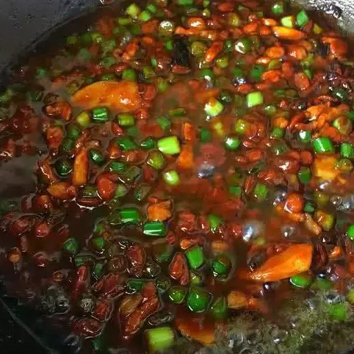 2.之後再將肉丁翻炒一會兒,就會提煉出大量的油脂,然後放入,準備好的蔥薑蒜,煸炒之後加入均勻,再加入適量的調味料,還有黃豆醬,之後加入甜面醬,繼續翻炒。