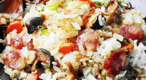 把米洗幹凈,將煮好的食材和湯一起倒入米中,用電飯煲或蒸飯鍋蒸熟即可!