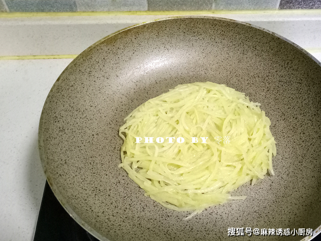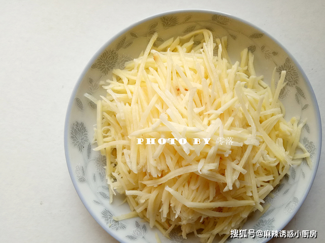 2、用刨絲器刨成細絲,土豆絲不用浸泡清水;建議下鍋前再刨絲,否則土豆易變色;
