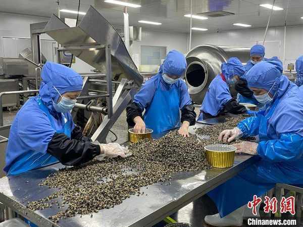 走進生產車間,工人正在精心挑選一顆顆鮮美的螺肉,經過解凍、清洗等步驟,再把挑選好的螺肉焯水,與十餘種調味品一同放置機器內攪拌。隨後,經過機器自動化包裝,一袋袋香辣美味的螺螄肉小吃下線。