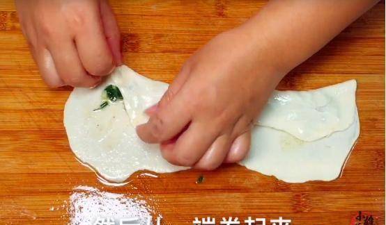 4、將案板清理幹凈後,在上面抹上適量的食用油,然後把松弛好的面劑子取出,向外拉伸後,並用搟面杖將其搟薄。同時把準備好的蔥花,均勻的擺放到面劑子中間,並用手將其向內進行收卷,將蔥花卷入其中。然後再制作一條相同的面劑子,每兩條為一組向內收卷,並擠壓平做成面胚備用。