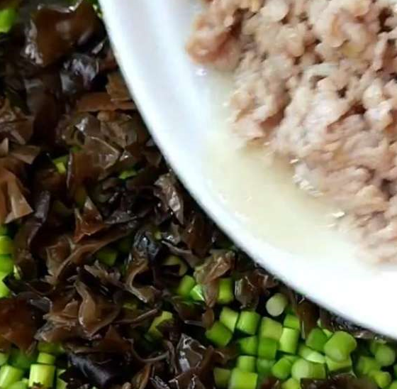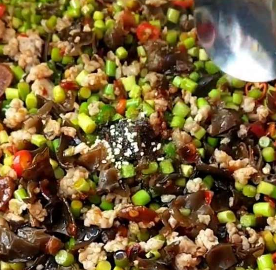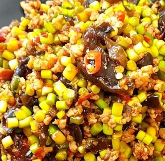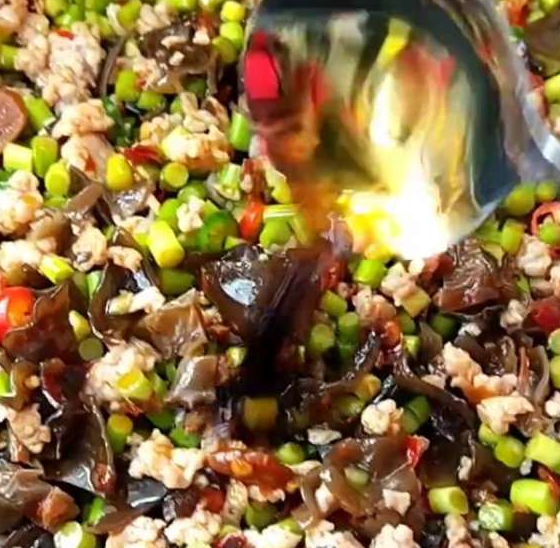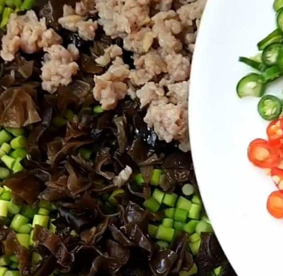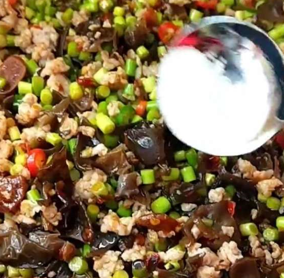 還有提前泡好的木耳,木耳也是切成丁,再下入炒好的肉。