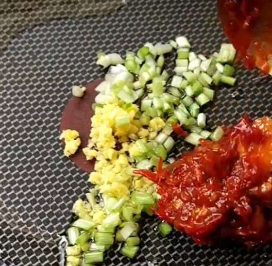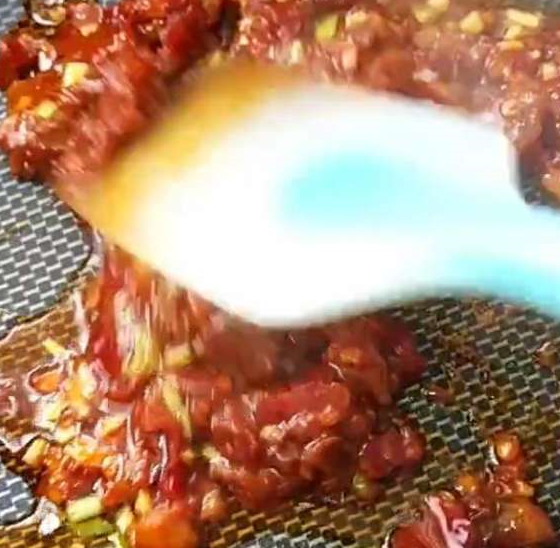 鍋中加少量的油,下入蔥薑末,再下入一勺的辣椒醬。
