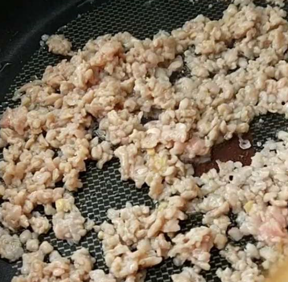 鍋中加入一點點的油,下入肉末炒,炒熟之後給盛出來。