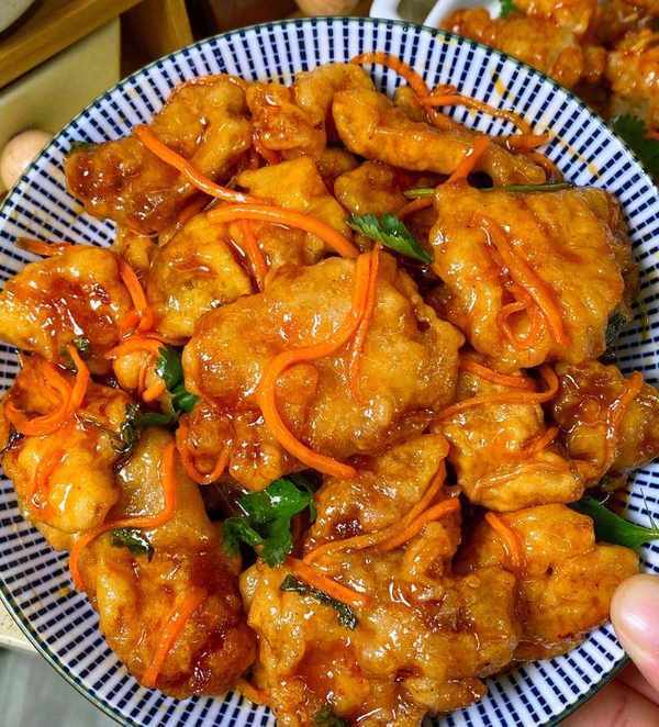 - 快速翻炒,使醬汁均勻附著在鍋包肉上,直至醬汁濃稠。