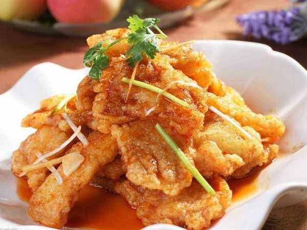- 將醃制好的豬肉片逐片裹上面粉糊,放入熱油中炸至金黃酥脆,撈出瀝幹油份。