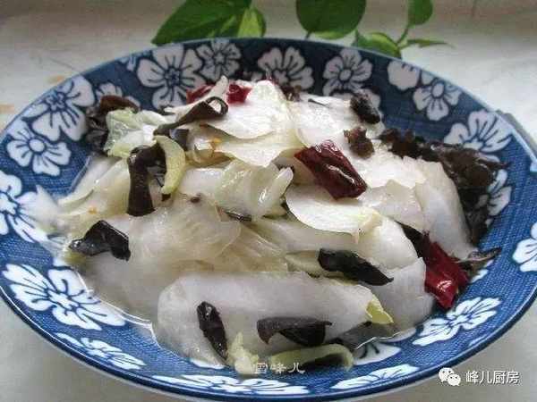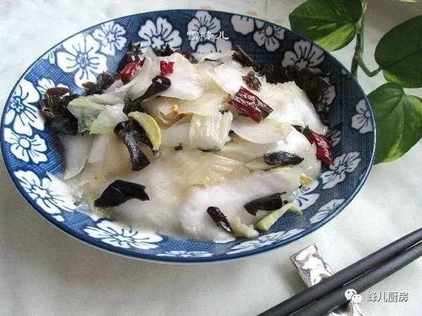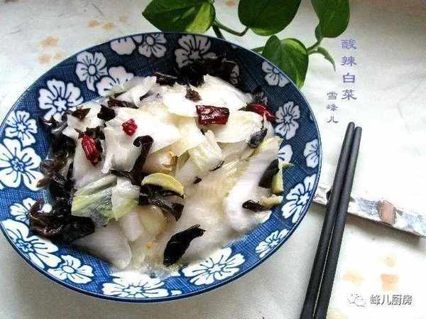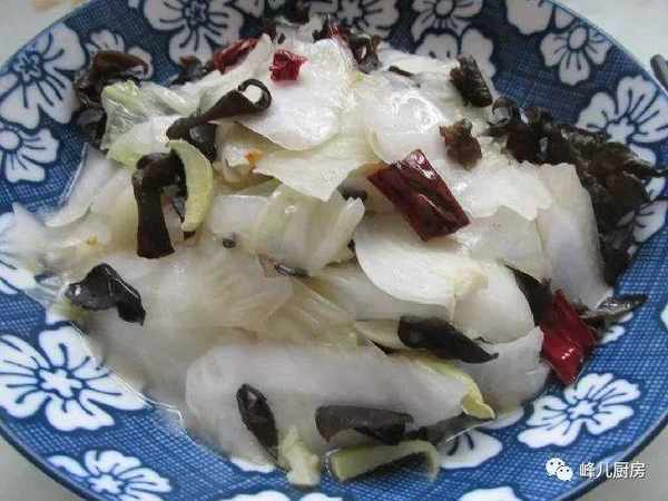 材料:白菜,黑木耳,幹辣椒,鹽,雞精,白醋,花生油。