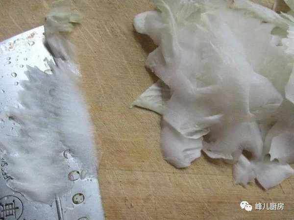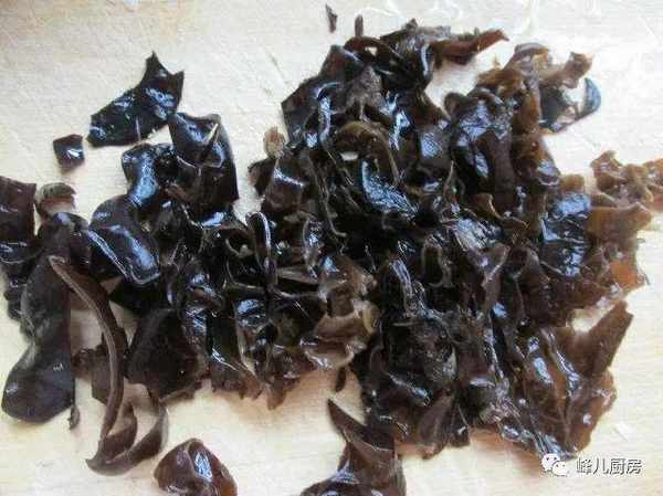 3、木耳泡發好後,一定要清洗幹凈,撈出控去水分,切成細長條形。