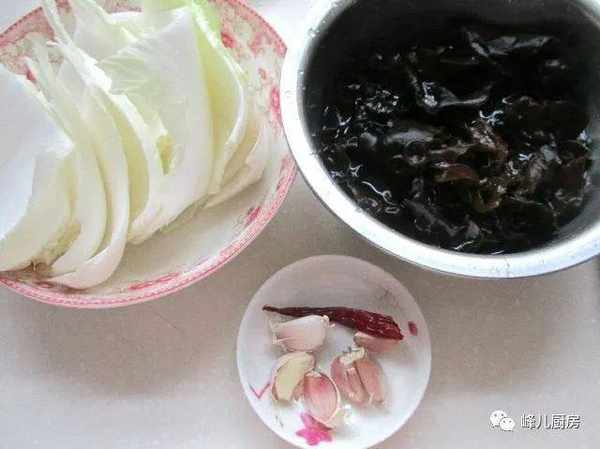 1、白菜洗凈,木耳泡發洗幹凈,蒜拌剝去皮,幹紅辣椒一根,都準備好。