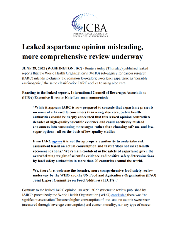 對於此事,國際飲料協會委員會(ICBA)當天即在官網發文稱,泄露的阿斯巴甜結論具有誤導性,更全面的審查正在進行。