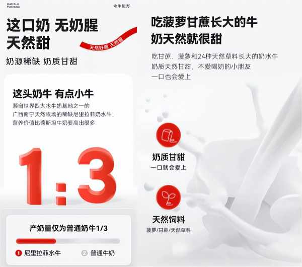 隔壁劉奶奶這款水牛奶,商品詳情頁一直在宣傳它的水牛有多稀有、水牛奶營養價值有多高。