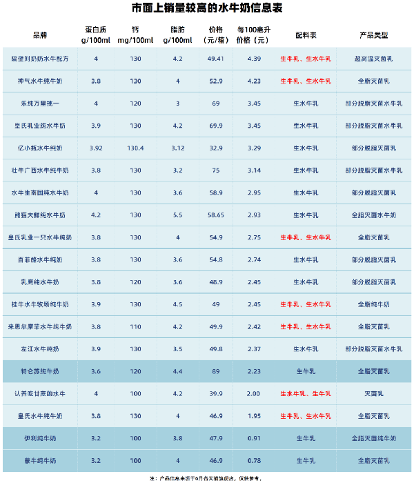 除瞭這款牛奶,花爸也幫大傢去看瞭市面上其他銷量較高的16款水牛奶,以及大傢熟知的伊利、蒙牛和特侖蘇純牛奶,將它們的產品價格和部分信息整理成瞭以下表格進行對比,大傢可以參考,根據自己的情況選擇購買。