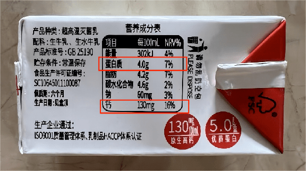 其中蛋白質達到瞭4.0g/100ml,鈣達到瞭130mg/100ml,在純牛奶中屬於較優秀的一款產品。