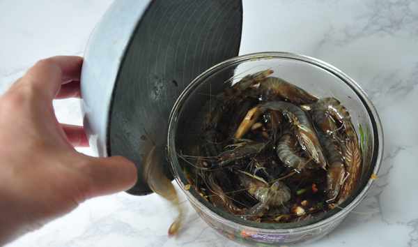 9再把嗆醉過的蝦倒進調料中,它們還會繼續蹦,所以一定要蓋上蓋子,否則會調料四濺的。