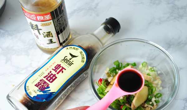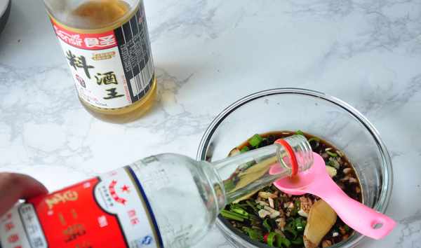 7另一個大碗將一大勺白酒加一大勺黃酒調勻。